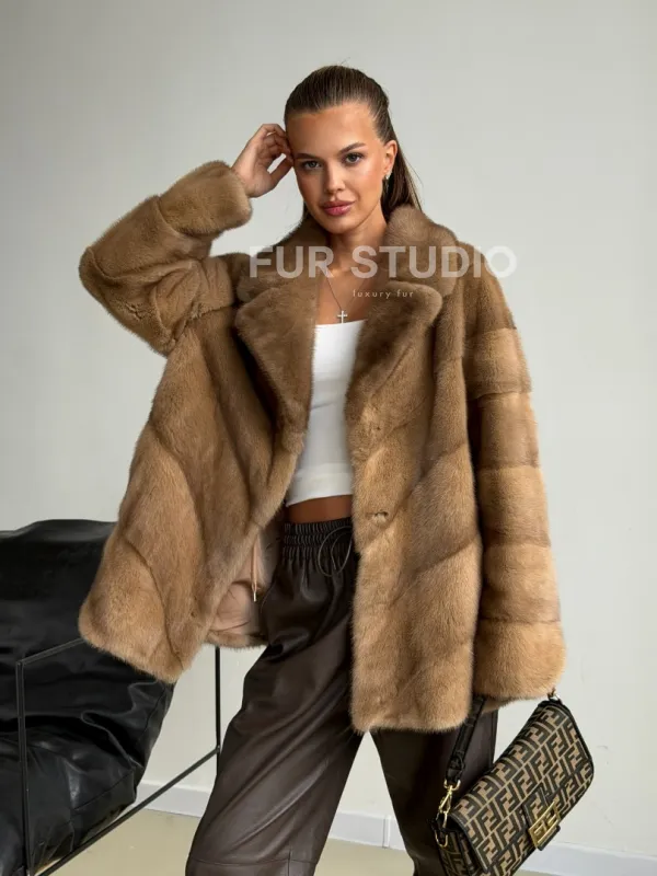 Мех данной шубы аукционная норка, цвет бежевый. Предлагается в размерах от 42 до 44. Длина модели 70-75 см, что выгодно подчеркивает фигуру девушек. Эта модель идеально подойдет для девушек и женщин, предпочитающих роскошные натуральные меха.