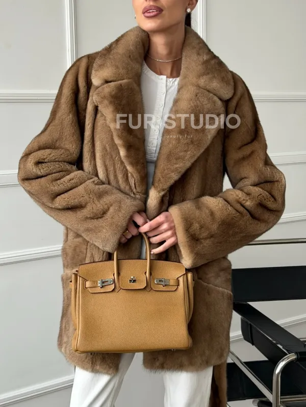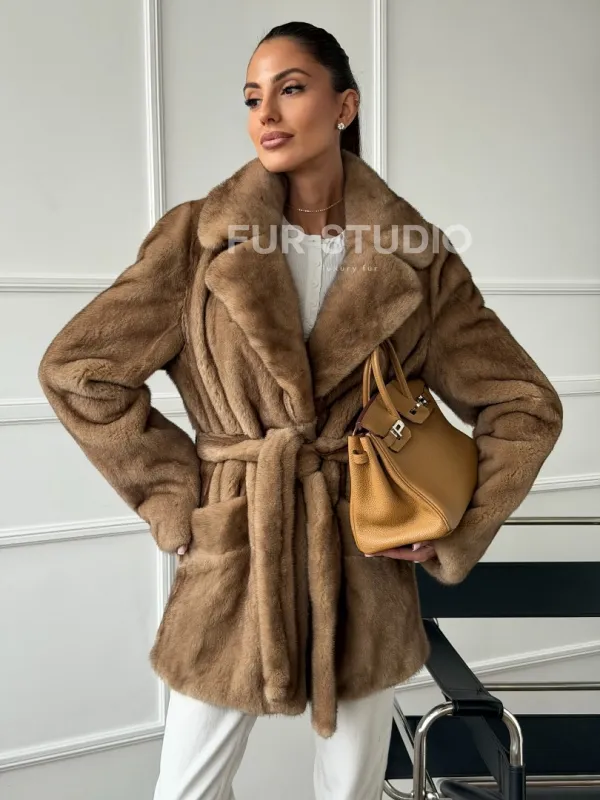 Полушубок норковый пастель с меховым поясом 102664