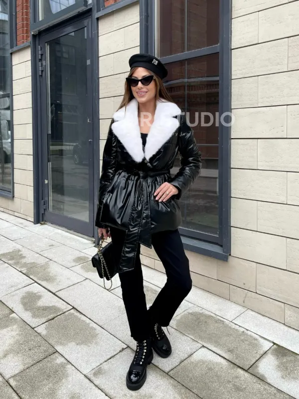 Пуховик с мехом белой норки в черном цвете 100402