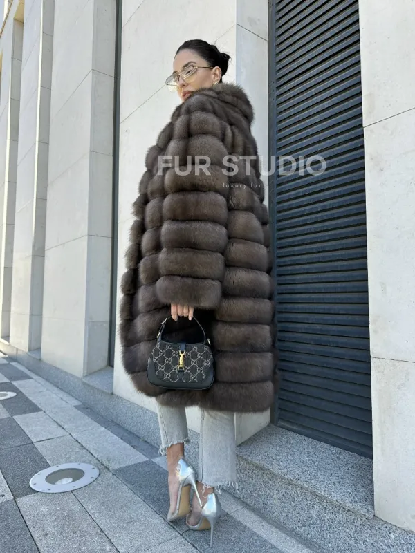 Легкая и стильная шуба из темного меха баргузинского соболя в длине миди — выбор деловых и активных женщин. Эта модель отлично подходит тем, кто ездит за рулем, но также и для любительниц прогуливаться пешком в любую погоду.